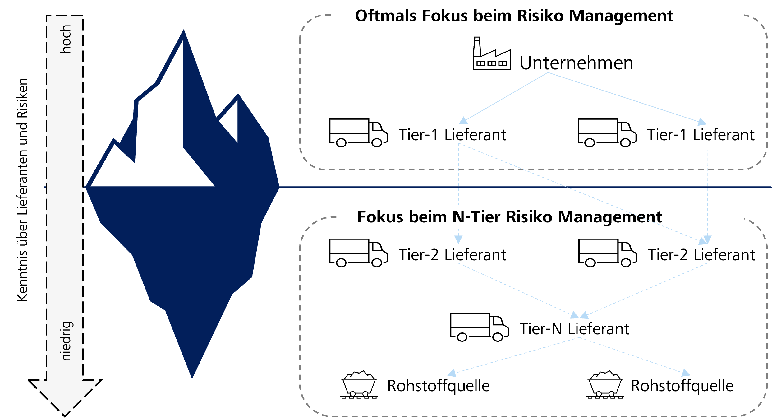 Transparenz und Resilienz: Der unsichtbare Teil des Eisbergs, die tieferen Lieferkettenebenen, bleibt häufig unberücksichtigt. Dies führt zu einem gefährlichen Mangel an Wissen über potenzielle Schwachstellen und versteckte Risiken, welche zu kostspieligen Wertschöpfungsunterbrechungen führen können.